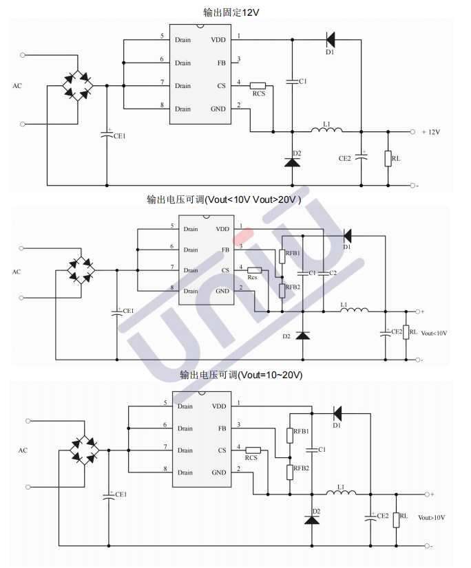 •主要特点:集成 650V 高压启动电路;多模式控制、无异音工作;支持降压和升降压拓扑;默认 12V 输出( FB 脚悬空);待机功耗低于 50mW;良好的线性调整率和负载调整率;集成软启动电路;内部保护功能 :过载保护 (OLP);逐周期电流限制 (OCP);输出过压保护 (OVP);VDD 过压、欠压和电压箝位保护