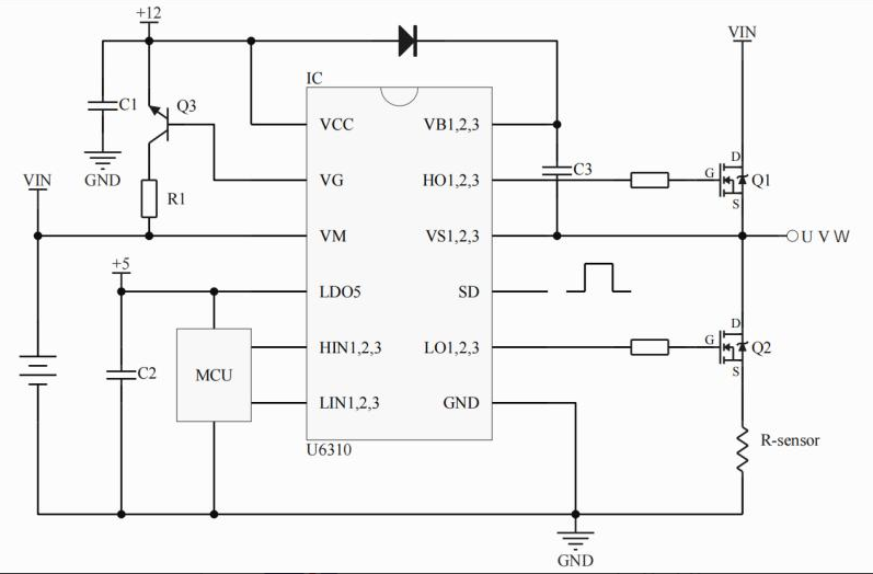 •主要特点:悬浮绝对电压: 70V;VM电压范围:5.0-70.0V; U6311 集成比较器(基准 200mV);兼容3.3/5V 输入逻辑;驱动电流:+1.5A/-1.8A(typ.);死区时间: 250ns (typ.);集成VCC和VBS欠压保护;集成12V LDO控制电路;集成5.0V LDO;5V LDO集成输出短路保护;过流检测(U6311);负瞬态电压承受能力;集成共模噪音消除电路;CPC24、SSOP24、QFN28 封装