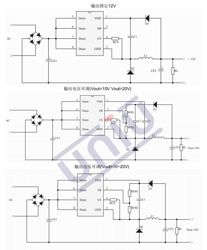 •主要特点:集成 650V 高压启动电路;多模式控制、无异音工作;支持降压和升降压拓扑;默认 12V 输出( FB 脚悬空);待机功耗低于 50mW;良好的线性调整率和负载调整率;集成软启动电路;内部保护功能 :过载保护 (OLP);逐周期电流限制 (OCP);输出过压保护 (OVP);VDD 过压、欠压和电压箝位保护